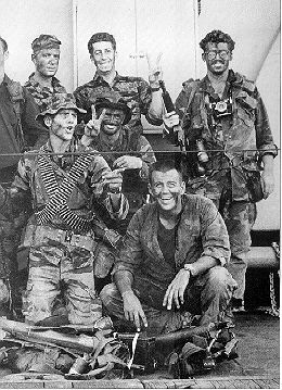 The ship was underway when our helicopters rendezvoused with it. As we unloaded Chip was taking pictures. He asked us to pose for a group shot with the captured VC flag. Giving his camera to a nearby sailor Chip asked him to shoot the photo and joined us. Years later this picture would appear in a Time-Life series titled "The Vietnam Experience." It was used to advertise the books and a new handle was hung on us as a result. The caption read "The Dirty Dozen - Vietnam Style." Part of the nickname remains with us today as our old teammates now refer to ALFA platoon as THE DIRTY DOZEN."